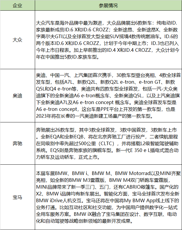 本次參展的主要跨國公司及其在中國的合資企業紛紛加大了投入力度,均有重要新能源、智能化產品推出。但不管是奧迪大眾還是奔馳寶馬,即將量產的車型和期貨車都沒有有顯著競爭優勢的產品和反超特斯拉乃至新勢力的跡象,如果這些傳統豪門不盡快在純電動汽車市場實現產品和銷量上的突破,也許其中部分品牌有進一步掉隊的風險,盡管其在燃油車領域的優勢還能在相當一段時間保證他們總銷量和財務指標上的優勢。
